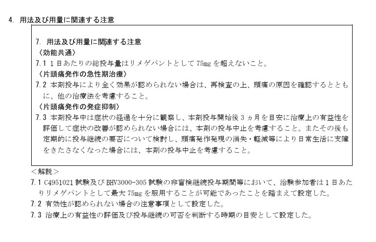 急性期治療では、片頭痛発作時に75mgを1錠服用します。